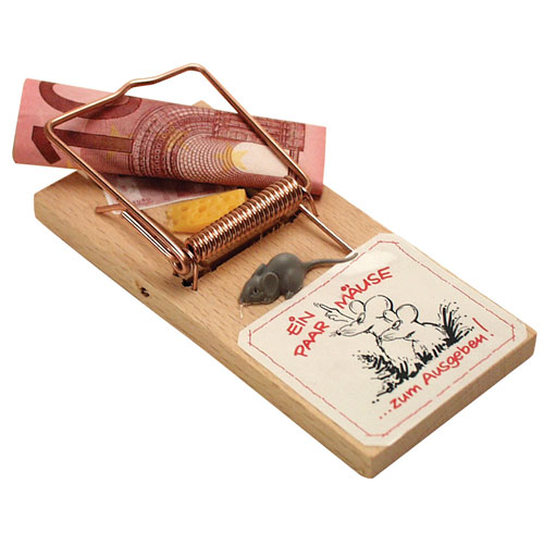 Mausefalle GeldEin originelles Geldgeschenk! Diese Falle schnappt man sich gerne - vor allem, wenn ein paar Mäuse drinstecken ... L/B/H 100x47x15mm (ohne Geldschein).